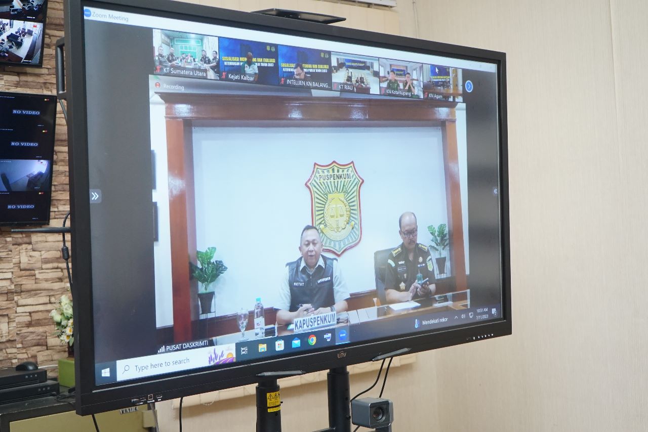 MEDAN-Kepala Kejaksaan Tinggi Sumatera Utara Idianto, SH,MH yang diwakili Asisten Bidang Intelijen Kejati Sumut I Made Sudarmawan, SH.MH bersama para Kasi mengikuti kegiatan Sosialisasi, Monitoring, dan Evaluasi Keterbukaan Informasi Publik Kejaksaan Republik Indonesia Tahun 2023. Sambutan dari Kepala Pusat Penerangan Hukum (Kapuspenkum) Dr. Ketut Sumedana memberikan sambutan secara daring, Selasa (11/7/2023).