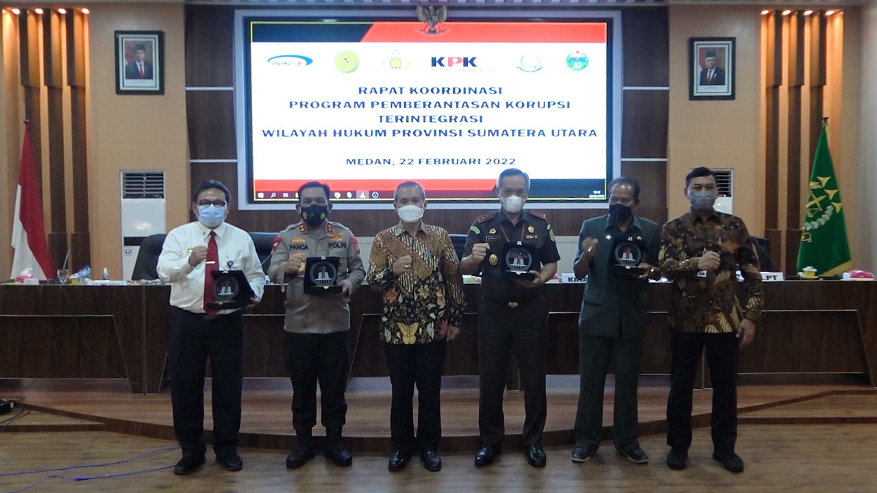 Jaringannews.com,Medan – Komisi Pemberantasan Korupsi (KPK) menggelar kegiatan untuk membangun sinergi antara aparat penegak hukum (APH) dengan Aparat Pengawasan Intern Pemerintah (APIP) dalam membangun kesamaan persepsi penegakan hukum di Sumatera Utara. Kegiatan rapat koordinasi program pemberantasan korupsi terintegrasi di wilayah Sumatera Utara yang digelar KPK ini dilaksanakan di Aula Kejati Sumut, Jalan AH Nasution Medan, (22/2/2022). Kegiatan serupa juga sudah pernah digelar di Mapolda Sumut.