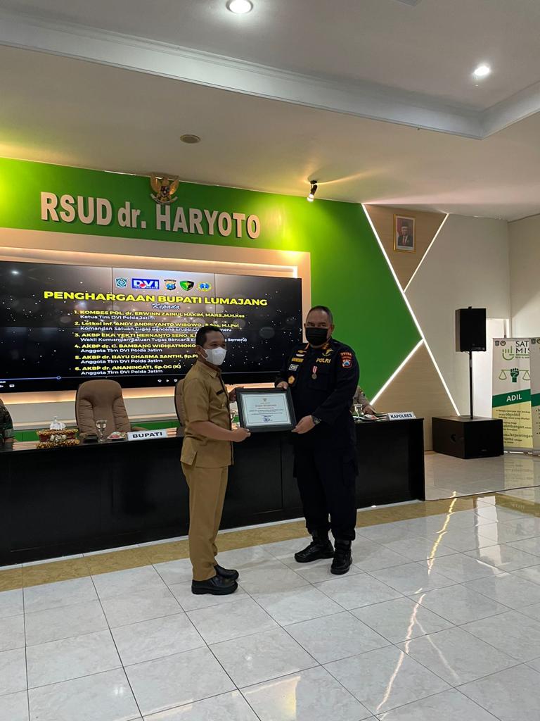 “Penghargaan kami berikan kepada Kabiddokkes Polda Jatim sebagai DVI Commander Ops DVI Bencana APG Gunung Semeru. Kemudian juga kami berikan kepada Dandim Lumajang sebagai Kasatgas bencana APG Gunung Semeru,” jelas Bupati Lumajang.