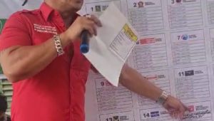 “Sebab suara masyarakat adalah penentu nasib bangsa kita ini nantinya mau dibawa ke arah mana kedepannya, jadi bapak dan ibu serta saudara – saudara yang hadir di tempat ini coba lihat dan perhatikan dengan cermat contoh kertas suara yang telah dibagikan oleh relawan” ujarnya.