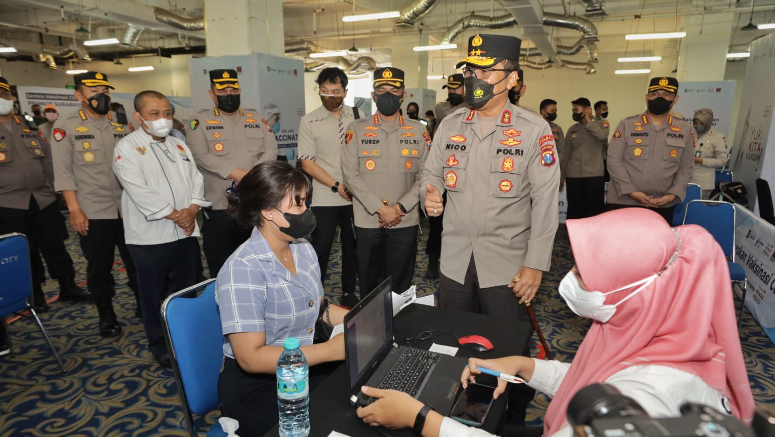 Jaringannews.com,Surabaya – Kapolda Jawa Timur Irjen Pol Nico Afinta bersama Kasiter Korem 084/BJ Kolonel Kav Jaelani yang berkesampatan mewakili Danrem 084/BJ dan Kadinkes Kota Surabaya ibu Nanik serta Kapolrestabes Surabaya Kombes Pol Ahmad Yusep dan pejabat utama Polda Jatim Rabu (16/2/2022) siang, mengecek pelaksanaan Vaksinasi dosis ketiga atau Booster di Grand City Mall, Surabaya.