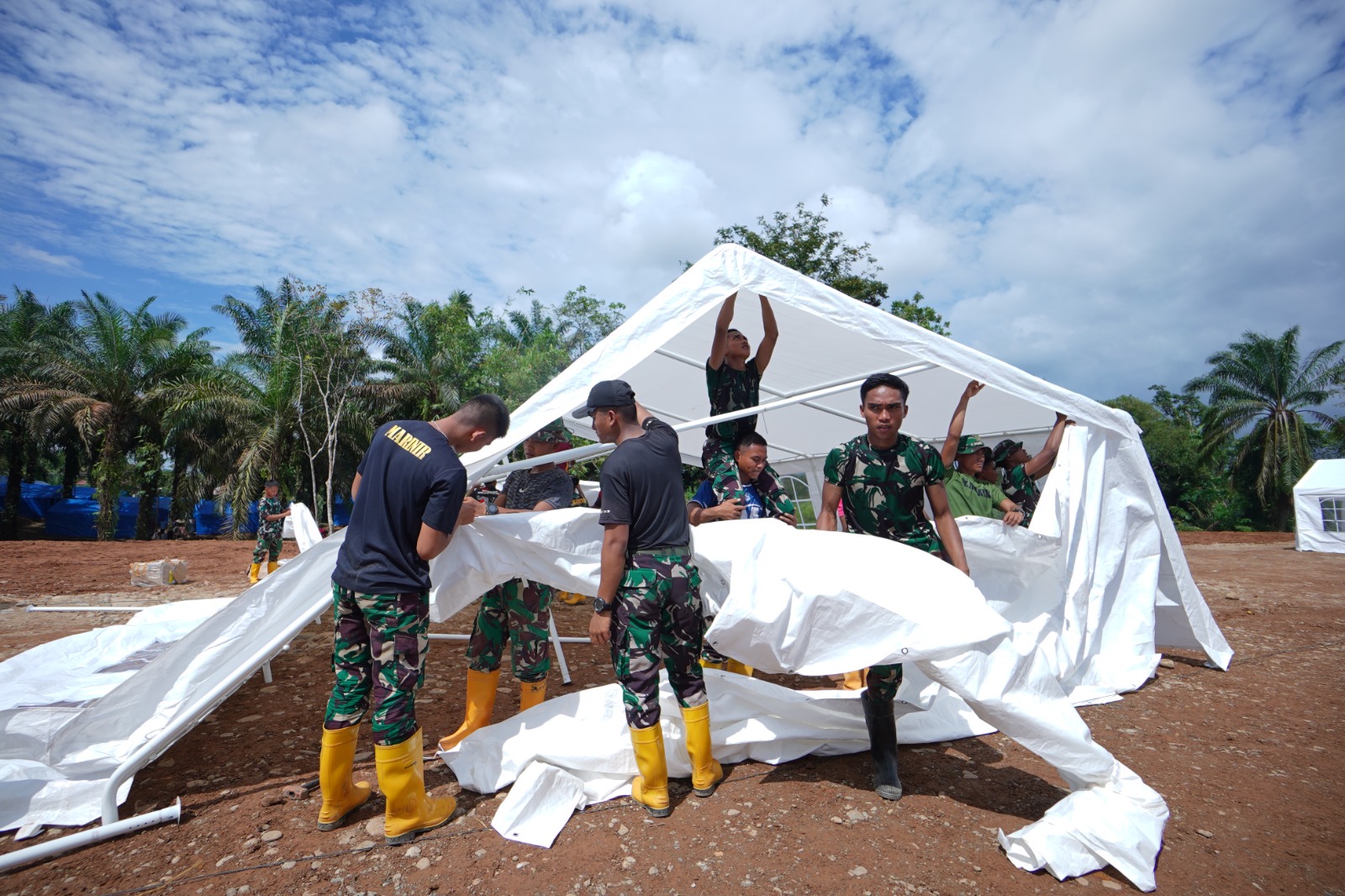 Anggota TNI saat melakukan pembangunan salah satu Tenda Dapur untuk HUNTARA di Batang Toru, Tapanuli Selatan.