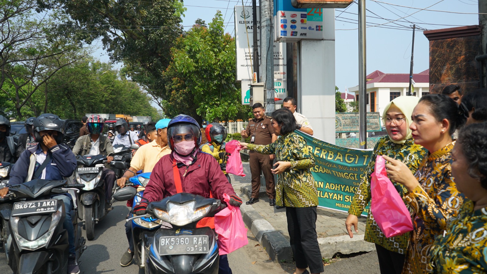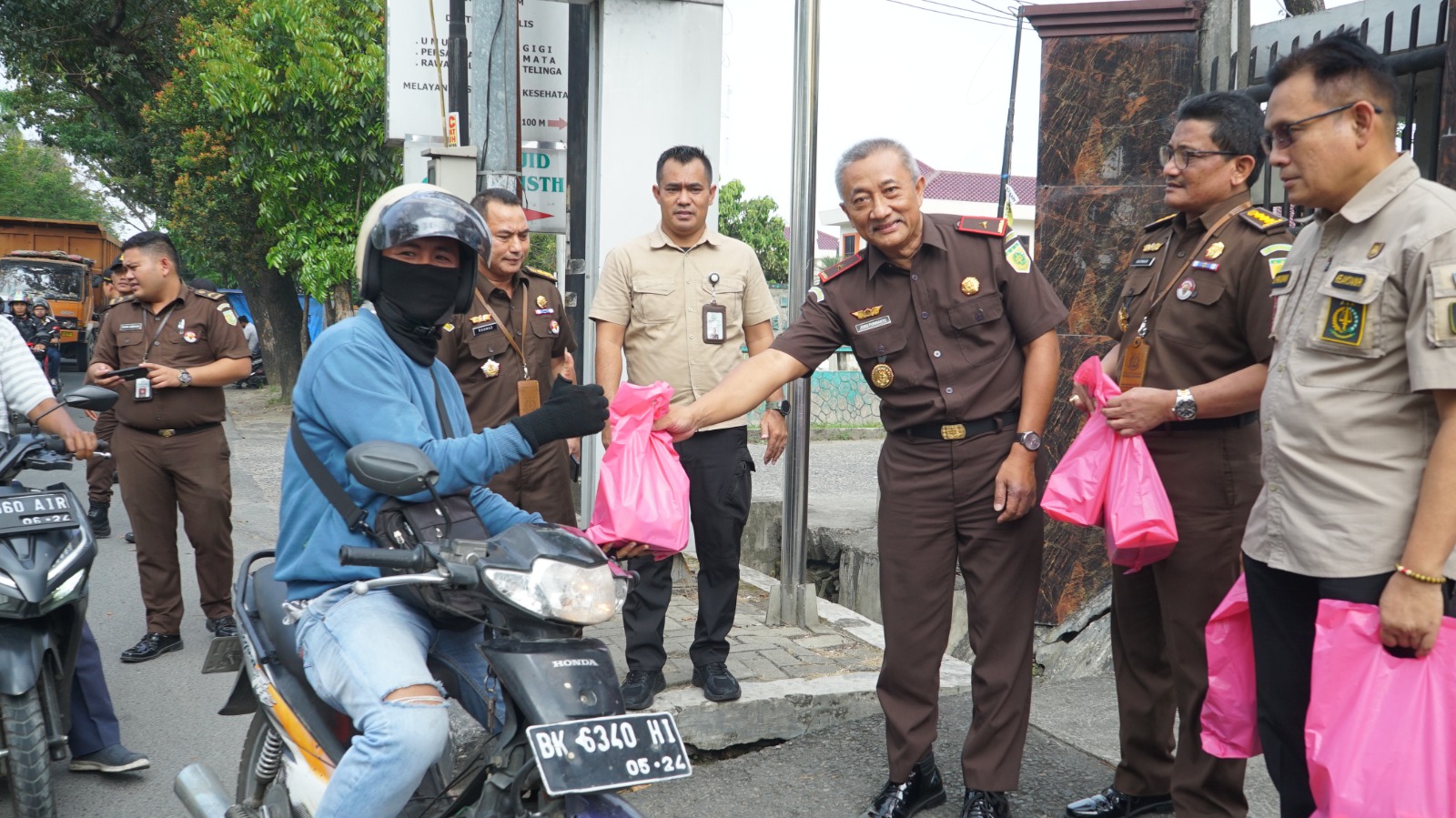 MEDAN – Kepala Kejaksaan Tinggi Sumatera Utara Idianto, SH,MH yang diwakili Wakajati Sumut Joko Purwanto,SH,MH, Asbin Sukarman Sumarinton,SH,MH, Asdatun Dr Prima Idwan Mariza, Aspidmil Kol. Chk Makmur Barus,SH,MH, Kabag TU dan Kasi Penkum Yos A Tarigan,SH,MH, mendampingi Pengurus Ikatan Adhyaksa Dharmakarini (IAD) Wilayah Sumut membagikan takjil berkah Ramadan kepada warga masyarakat yang melintas di depan kantor Kejati Sumut Jalan AH Nasution Medan, Rabu (12/4/2023).