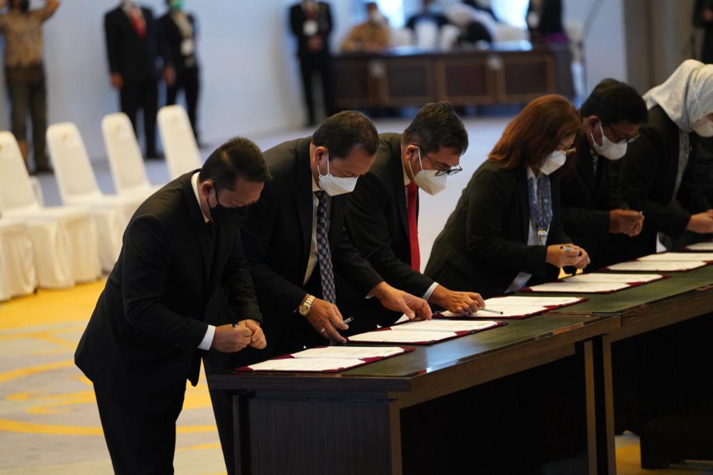 Acara Penandatanganan Nota Kesepahaman dan Pedoman Kerja Bersama Sistem Peradilan Pidana Terpadu Berbasis Teknologi Informasi (SPPT-TI) 2022 dilaksanakan dengan menerapkan protokol kesehatan. (K.3.3.1)