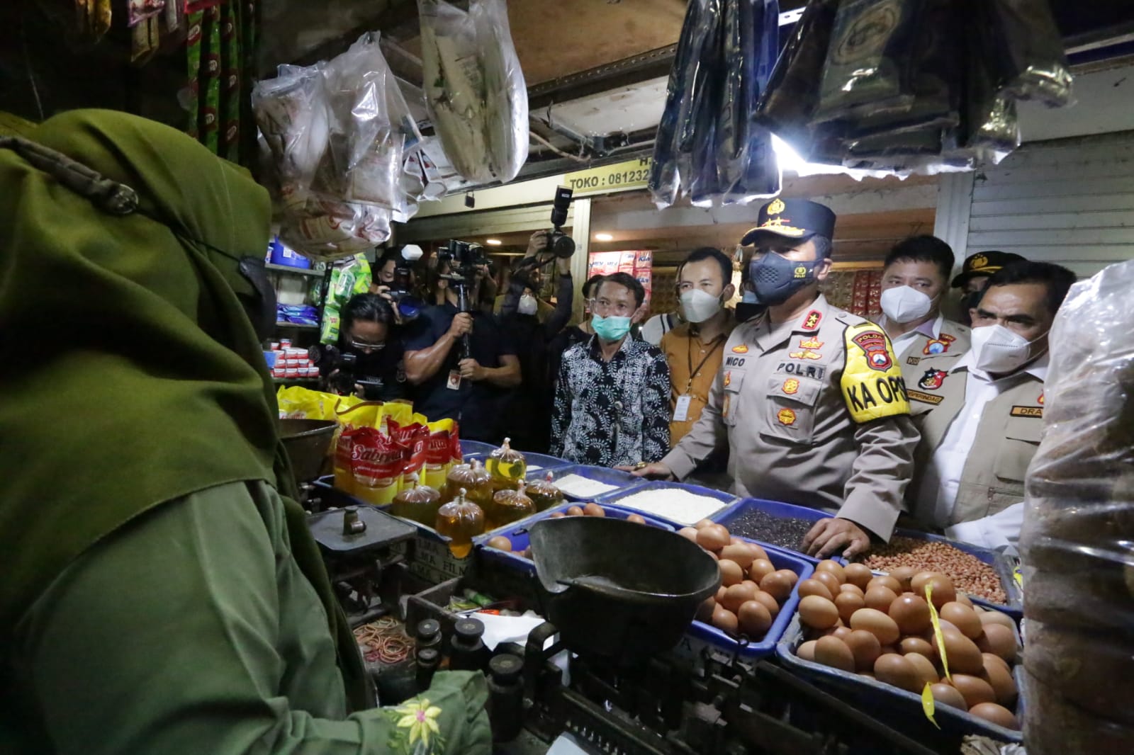 Jaringannews.com,Surabaya – Kapolda Jawa Timur Irjen Pol Nico Afinta bersama Forkopimda jatim dalam hal ini Gubernur Jatim yang diwakili Kepala Dinas Perindustrian dan Perdagangan Jatim Drajat Irawan, Pangdam V/Brawijaya yang diwakili Dandim Surabaya Selatan Kol Inf Jacob Janes Patty, Kepala Bulog Jatim, Kepala Pasar Wilayah Surabaya, Tim Satgas Pangan Jatim serta Pejabat Utama Polda Jatim dan Kapolrestabes Surabaya, Selasa (22/3/2022) siang melakukan pengecekan ketersediaan minyak goreng kemasan maupun minyak goreng curah di Pasar Wonokromo, Surabaya.