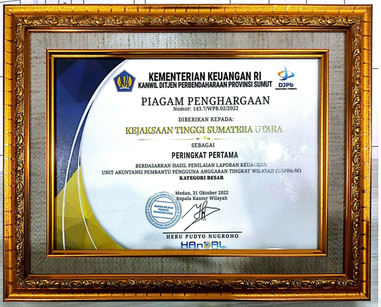 MEDAN – Kepala Kejaksaan Tinggi Sumatera Utara (Kajati Sumut) Idianto, SH, MH yang diwakili Wakajati Sumut Asnawi, SH, MH menerima penghargaan dari Kementerian Keuangan sebagai Peringkat Pertama Pelaporan Keuangan Terbaik yang diserahkan langsung oleh Kepala Kanwil Direktorat Jenderal Perbendaharaan (DJPb) Sumut Kementerian Keuangan RI Heru Pudyo Nugoroho, Kamis (3/11/2022) di Aula Tengku Rizal Nurdin, Rumah Dinas Gubernur, Jalan Jenderal Sudirman, Medan.