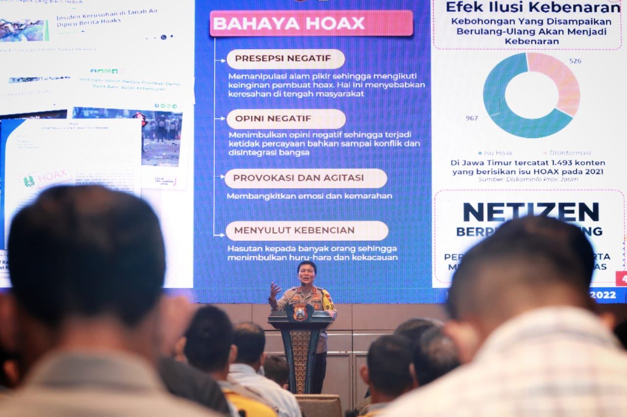 “Bahaya terkait berita Hoax dapat menimbulkan persepsi maupun opini negatif, provokasi dan agitasi serta dapat menimbulkan kebencian sehingga Netizen berperan penting dalam memupuk persatuan serta menjaga situasi Kamtibmas,” papar Kapolda Jatim.