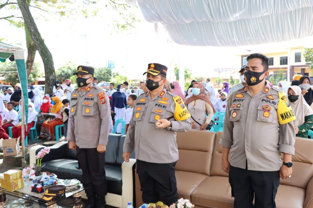 Vaksinasi berjalan gembira yang dihibur Kapolres Batu Bara AKBP Ikhwan, S.H.,M.H.bersama Waka Polres Kompol Rudy Candra, S.H. MM. dengan pemberian jajanan dan berikan hadiah lomba puisi serta berikan santunan kepada anak yatim.