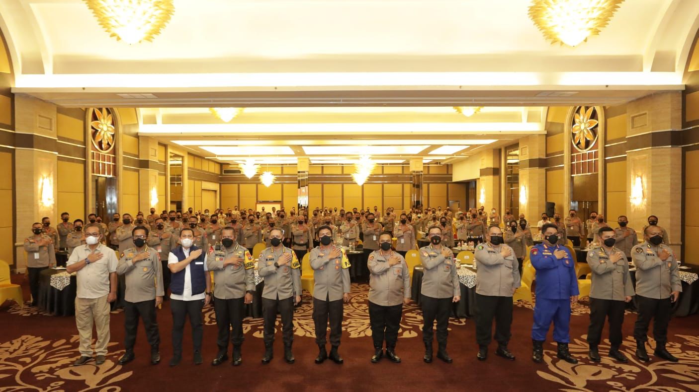 Jatim – Kapolda Jatim memberikan pengarahan dan penekanan dalam acara Rapat Kerja Teknis (Rakernis) Fungsi Logistik Polda Jatim T.A. 2022 dan Pelatihan Peningkatan Kemampuan Operator Aplikasi Simak Sakti BMN, pada Selasa (21/6/2022) di hotel Wyndham Surabaya.